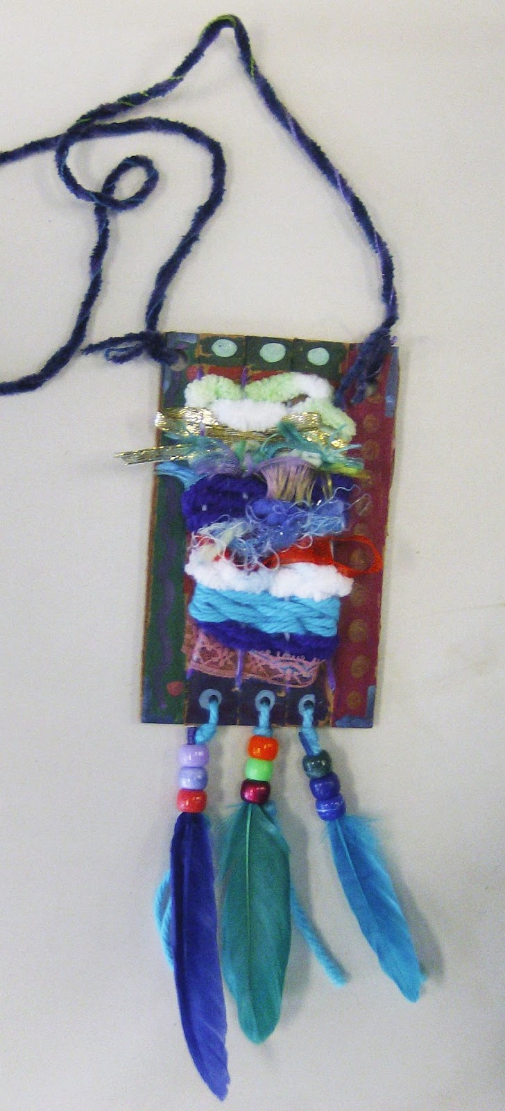 These wearable weavings are created on very small cardboard looms. The weaving is not removed from the loom.